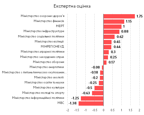 Хуже всего, по мнению экспертов, выполняли текущую работу и не спешили с реформами Министерство внутренних дел (эксперты отметили, что единственной настоящей реформой этого ведомства было создание патрульной полиции), Министерство информационной политики и Министерство молодежи и спорта.