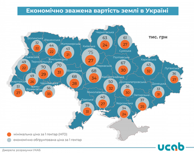 В 2020 году арендная плата за землю составляла в среднем 3425 грн за 1 гектар по Украине, а ставка по долгосрочным кредитам в иностранной валюте — 6,7%. Таким образом, экономически обоснованная средняя стоимость земли в Украине составляет 51,2 тыс. грн за гектар.