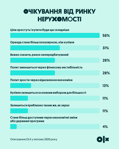 Абсолютное большинство молодых украинцев (56%) уверены, что в ближайшие 5 лет на рынке недвижимости цены вырастут еще больше и покупка жилья станет менее доступной. Высокая (31%) доля тех, кто считает, что аренда станет популярнее, чем покупка, следуя тренду молодежи из стран Запада.