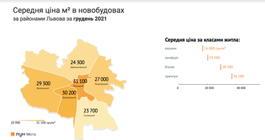 У Львові найдорожчі квадрати у центрі міста: за метр у Галицькому районі просять в середньому 31 100 грн, що на 800 грн дорожче, ніж у листопаді.