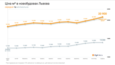 У Львові ціна зросла на 600 грн за квадрат – зараз 20 900 грн. При цьому мінімальна вартість квадрату залишилася незмінною – 14 000 грн.